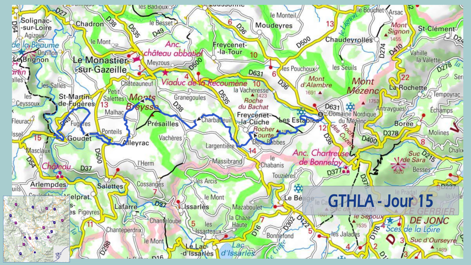 Etape 15 : direction des hautes gorges de la Loire et le château de Goudet. Très belle étape avec une vue sur le Mont-Gerbier-de-Jonc ( !), le Mont Mézenc en toile de fond, le détour au pied de la Roche Tourte (escalade), le petit et le grand Suc, le râteau magistral du Moulin du Rocher (orgues basaltiques et impasse à vélo) et enfin la descente belle et engagée sur Goudet.