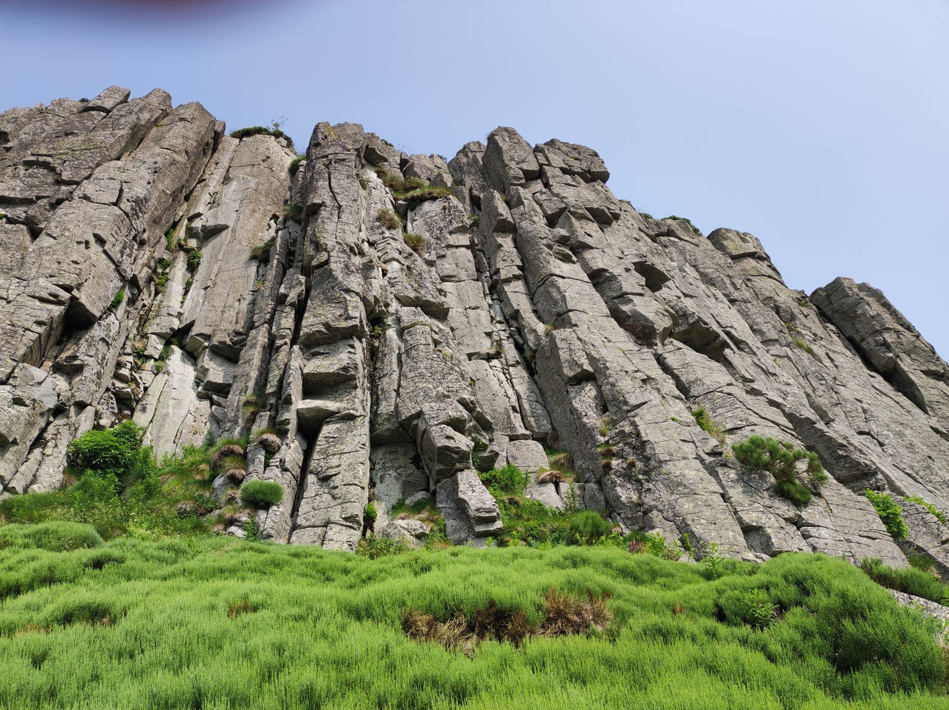 Nous arrivons au Rocher de Tourte, école d’escalade sur de beaux reliefs basaltiques (ou granitiques ?). Nous faisons le détour pour aller au pied des voies et admirer le grain du rocher, un géant en partance pour l’île de Pâques, hautain, nous surveille de son regard de pierre.