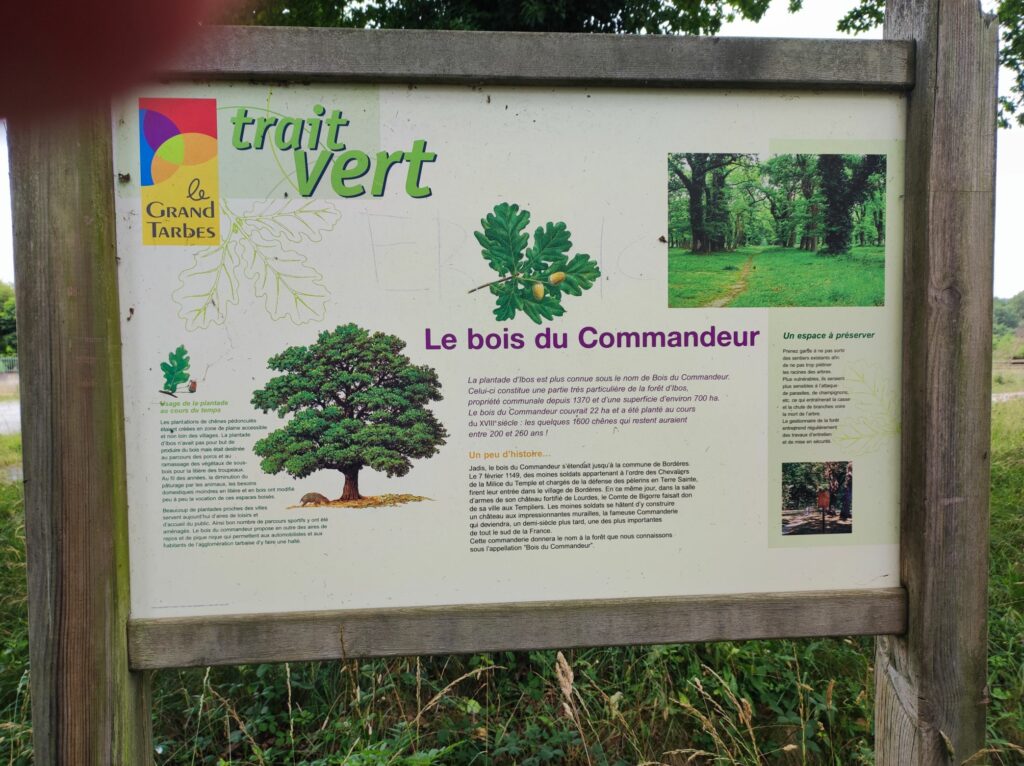 Le GR nous mène tranquillement vers Ibos, nous traversons une « plantade » de chênes, ces arbres ont été plantés non pas pour le bois comme nous le pensions (genre, pour construire les vaisseaux de ligne de Louis XIV) mais pour … les glands et l’élevage de porcs.