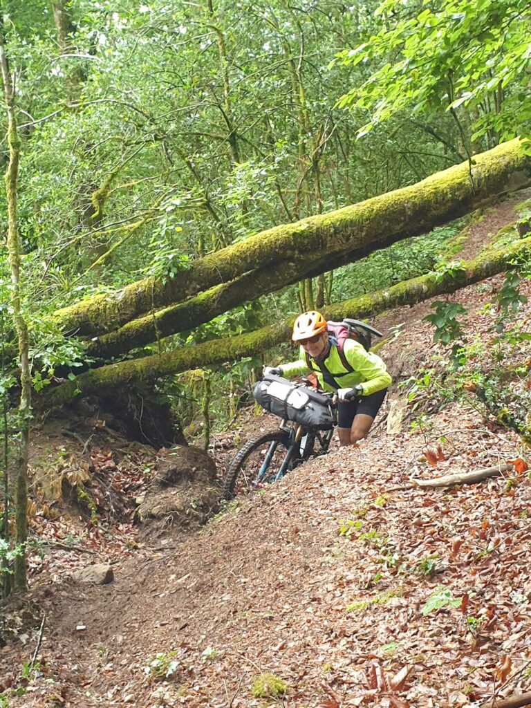 Ce sentier est très beau, à pied, mais sans position GPS du fait de la couverture forestière dense et des pentes escarpées, nous progressons à l’aveugle, sans avoir aucune idée du temps qu’il va nous falloir pour arriver à sortir de ce … coupe-gorge vélocipédique.